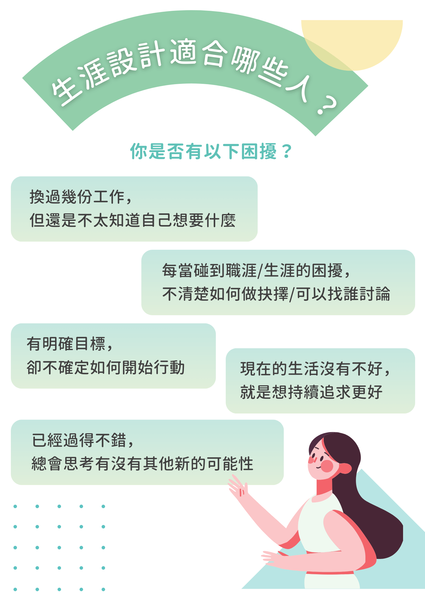 生涯設計師團隊過去 7 年,生涯服務累積破千人、培育超過三十位諮詢師,透過生涯設計的工具與方法提供諮詢、課程、講座、工作坊等服務,協助人們『更快地看見生涯抉擇的盲點, 找出適合自己的工作與生活模式。』